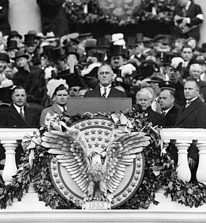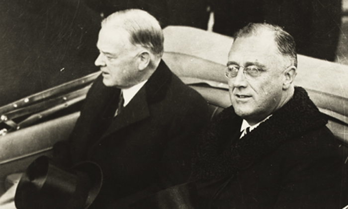 The presidential election of November 1932 was a landslide for Franklin D. Roosevelt. But FDR’s inauguration would not take place until March 4, 1933. Americans eager for fresh leadership would have to wait four agonizing months, as the nation’s economy tumbled to its lowest point in the worst economic crisis of its history. Banks failed. Homeless and hungry families shivered through a bitter winter. Sitting president Herbert Hoover hesitated to act boldly on his own authority and pressed FDR, unavailingly, to voice support for his policies. The Hoover-appointed President’s Committee on Social Trends warned of “violent revolution.” But finally the orderly transfer of power for which American democracy is known took place on a chill, damp day in the nation’s capital. FDR told the assembled crowd he would address mass unemployment as urgently as one might meet the emergency of war. “The only thing we have to fear,” he famously said, “is fear itself.”